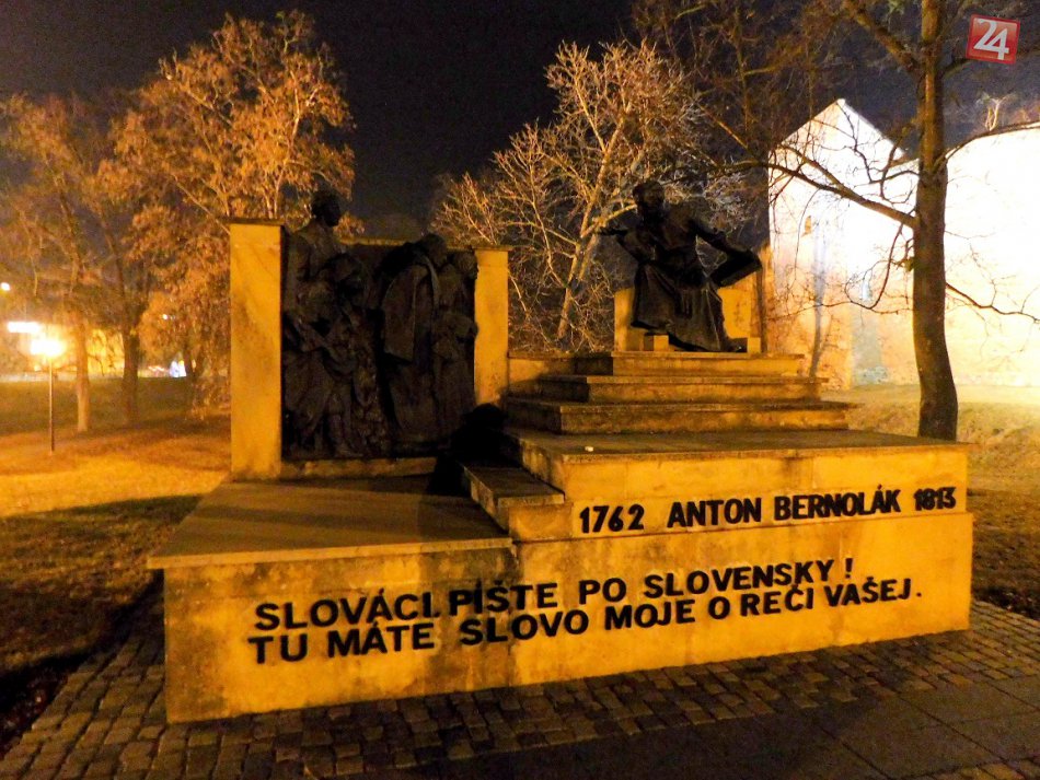 Známy pamätník Antona Bernoláka, v pozadí vysvietený park a hradby