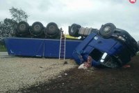 Nehoda pri Trnave: Kamión so štrkom sa prevrátil mimo cesty, FOTO
