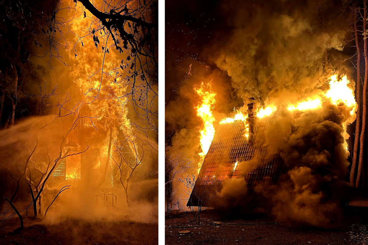 Galéria k článku Nočná DRÁMA a zásah hasičov: Drevenú chatu totálne pohltili PLAMENE! FOTO