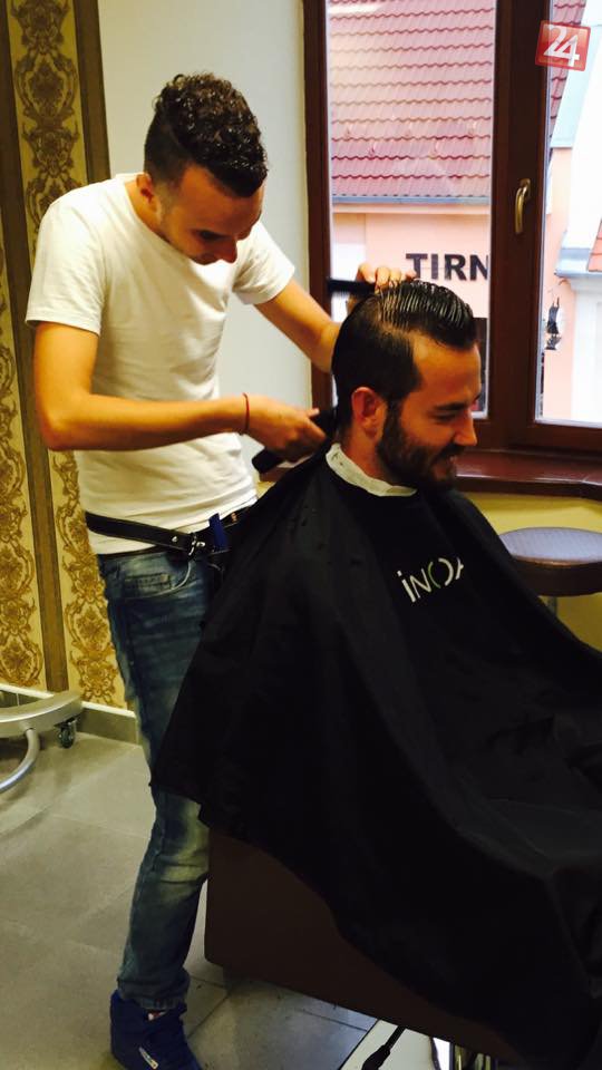 Trnavský kaderník Matej v akcii. Na zábere upravuje vlasy známemu módnemu návrhárovi, stylistovi a fotografovi Lukášovi Kimličkovi.