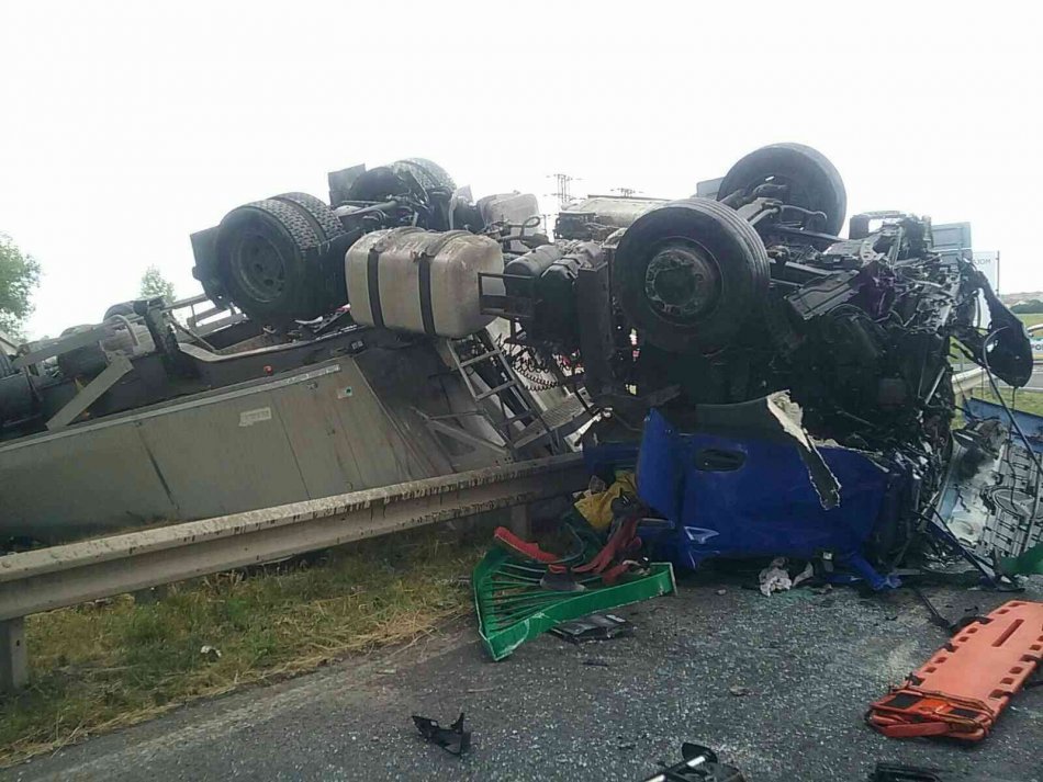 Galéria k článku Prerazili zvodidlá: Z nadjazdu sa ZRÚTIL kamión a auto, hlásia mŕtvych!