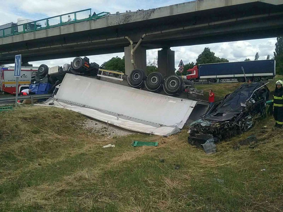 Galéria k článku Prerazili zvodidlá: Z nadjazdu sa ZRÚTIL kamión a auto, hlásia mŕtvych!