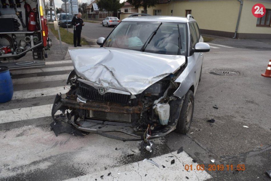 Galéria k článku Zrážka dvoch osobných áut: Jedno skončilo po náraze prevrátené na bok, FOTO