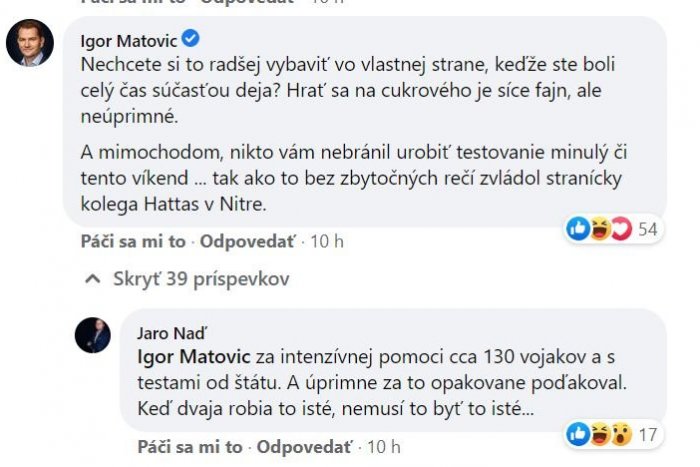Netrvalo dlho a priamo pod príspevok sa v komentári ozval aj samotný Igor Matovič. „Nechcete si to radšej vybaviť vo vlastnej strane, keďže ste boli celý čas súčasťou deja? Hrať sa na cukrového je síce fajn, ale neúprimné. A mimochodom, nikto vám nebránil urobiť testovanie minulý či tento víkend… Tak ako to bez zbytočných rečí zvládol stranícky kolega Hattas v Nitre,“ stojí v odpovedi premiéra.