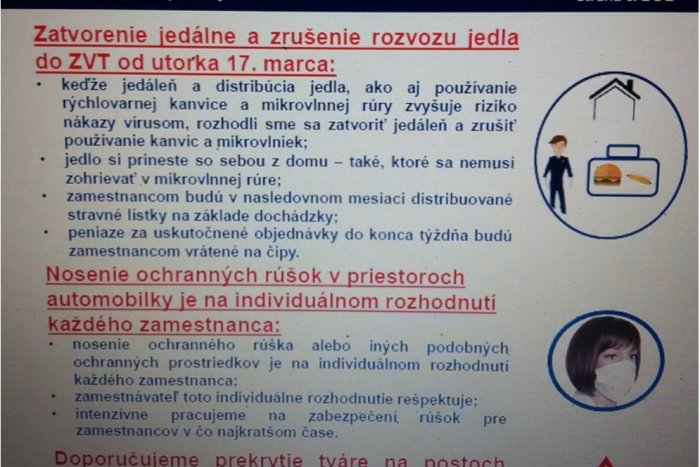 „Od utorka 17.3. nebude prebiehať distribúcia stravy a jedáleň bude zatvorená. Zamestnanci dostanú gastrolístky. Chceme obmedziť stretávanie sa veľkých skupín zamestnancov a minimalizovať kontakt.“, uviedli odbory.