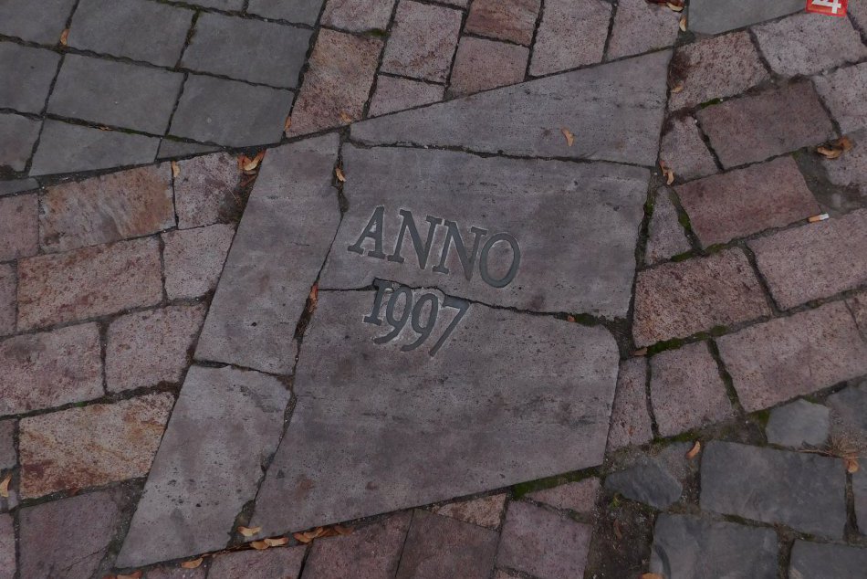 „Keď sa pozriete do polovice tohto námestíčka, vidíme na námestí dlažbu, na ktorej sa na určitých úsekoch nachádza aj takáto ružová dlažba s rokom 1997 (na dlažbe sa nachádza nápis „Anno“, to jest. „rok“, pozn. red.). Tá nám vlastne oddeľuje hranicu pôvodného stredovekého cintorína,“ vysvetľuje kunsthistorička Emília Izakovičová. Ružovkastý pás je teda pripomienkou zaniknutého stredovekého cintorína. Označuje miesta, kde sa nachádzal.