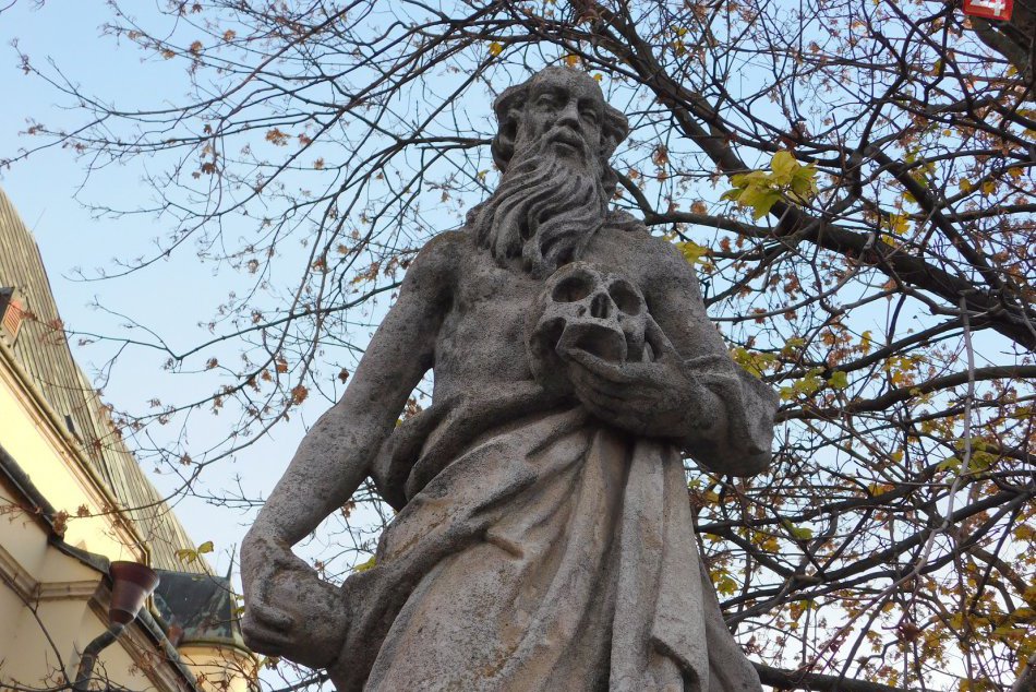 Zaujímavý je aj príbeh dvoch známych sôch, ktoré sú akousi vstupnou bránou na námestie. „Máme tu vyvýšenú časť (oblasť chodníka a schodov, ktoré sa nachádzajú pri Bazilike sv. Mikuláša, pozn. red.), kde pôvodne bol cintorín, ale v neskorších rokoch dvadsiateho storočia tam bola prenesená hlina, čiže preto tam vznikol výstupok, na ktorom sú schodíky, ktoré tam predtým neboli. Zároveň sa sem premiestnili aj tieto dve sochy. Ako je vidieť, svätý Hieronym má v ruke lebku. Takto sa svätec často znázorňoval pri vstupe na cintorín. A potom tu máme svätého Petra, ktorý má kľúče od nebeskej brány a znázorňuje prechod medzi životom a smrťou,“ prezradila Izakovičová.
