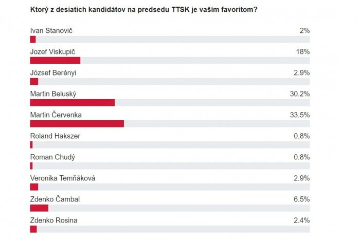 V predvolebnej ankete o kreslo župana TTSK s miernym náskokom zvíťazil kandidát Martin Červenka, ktorý získal 82 hlasov, čo predstavuje 33,5 % zo všetkých hlasov.
